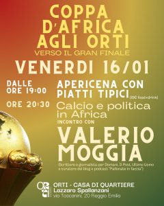Questa settimana gran finale della “Coppa d’Africa agli Orti” che dal 21 dicembre vede la proiezione alla Casa di Quartiere Orti-Spallanzani di via Toscanini 20. La più importante manifestazione calcistica del continente africano che si svolge quest’anno in Marocco, vedrà il gran finale non soltanto con la trasmissione delle semifinali e finali ma anche con cibo e cultura per ragionare sulla relazione tra calcio e politica.